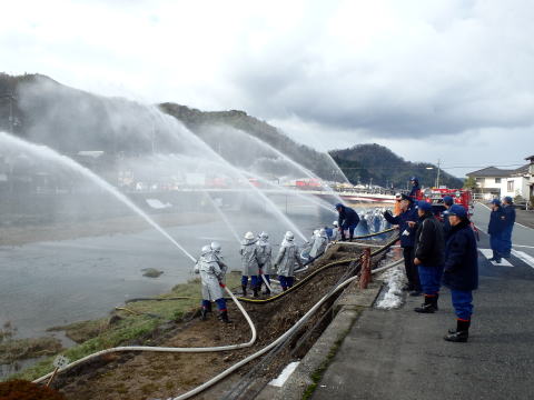 式の後寒い中、岩井温泉横の蒲生川で放水式でした。