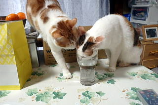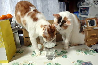左ちびと右ぴぃちゃんは白湯が大好きで取り合って飲んでいます。 |