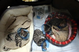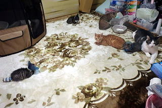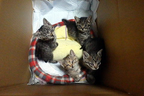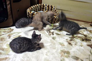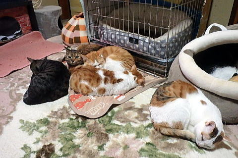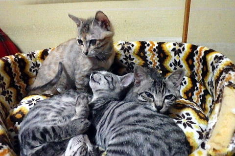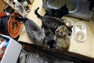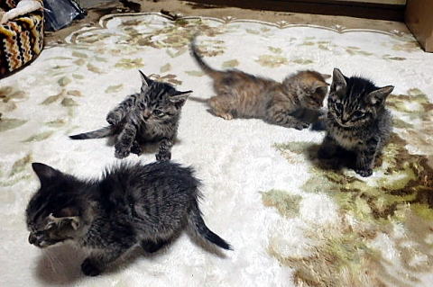 こちらも全部女の子でサバトラ二人、洋猫風のが二人、黒猫一人です。
