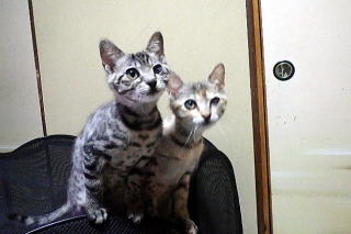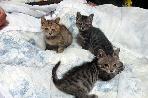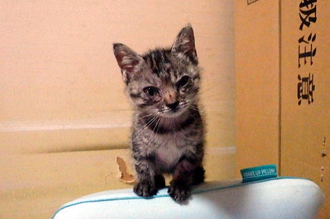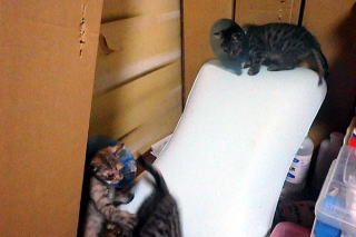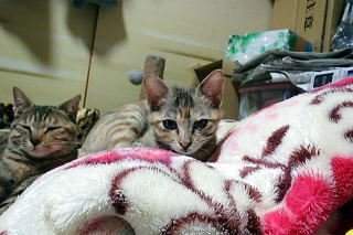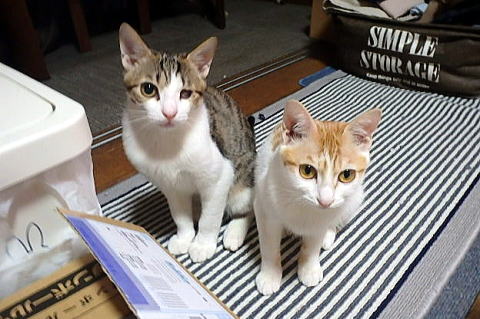 新しく保護した子猫です。左が片目が悪く十兵衛(男の子)、右が小ぶりでちび(女の子)です。