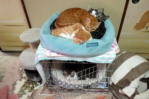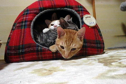 小さな猫ハウスにこれでもかというほどニャンコが詰まっています。