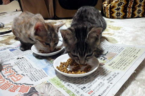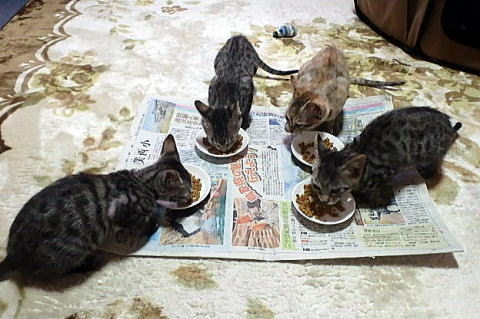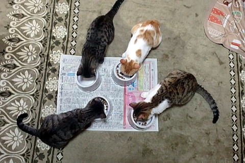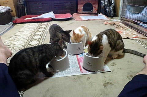 上右がちび、左がぐれ、下左がしろ、右がじゅうべえ どの子も食欲旺盛です。