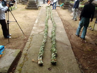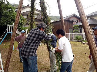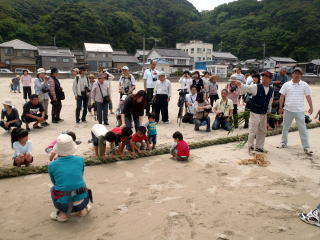 生の菖蒲と萱、ヨモギで綱を編みお宮組と観音さん組に分かれて浜で綱引きをします。